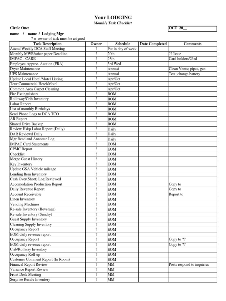 Hotel Monthly Task Checklist Inventory Industries